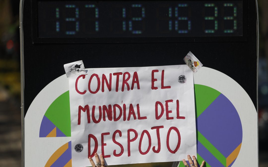 “El Mundial trae un sinnúmero de consecuencias que van desde la contaminación, el desplazamiento forzado de familias populares, comunidades y pueblos originarios, el despojo de bienes comunes como el agua o el aumento del costo del alquiler en un 155%”, denunció Diana, joven encargada de leer el manifiesto junto al reloj en el céntrico Bosque de Chapultepec y que marca la cuenta regresiva en la capital para que comience el torneo de futbol.