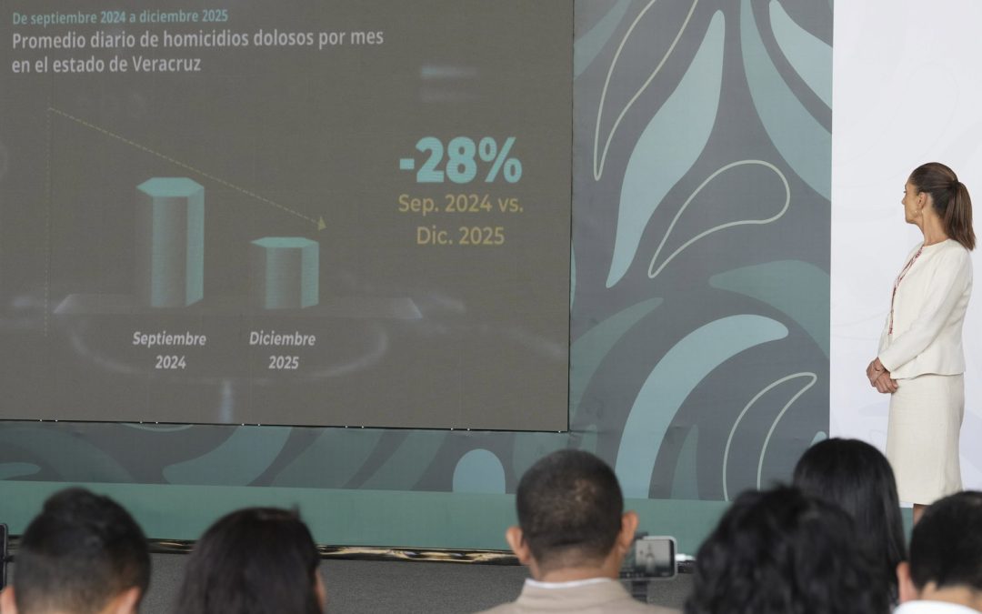 La presidenta Claudia Sheinbaum Pardo destacó que, en Veracruz, con la Estrategia Nacional de Seguridad y gracias a la coordinación que hay con la entidad, se redujo en un 28% el homicidio doloso, entre septiembre de 2024 y diciembre de 2025, al pasar de 3.13 a 2.48 el promedio diario de víctimas de ese delito.