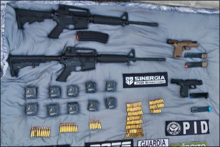 Las Comandancias de la XII Región Militar y 17/a. Zona Militar, informaron que el resultado del apoyo que brindaron a las autoridades de los tres órdenes de gobierno para la ejecución de dos Órdenes Técnicas de Investigación en esos municipios de Querétaro fue asegurar 6 armas de fuego (4 largas y 2 cortas), 12 cargadores, 587 cartuchos, 2 granadas de fragmentación, 2 vehículos, diverso equipo táctico y electrónico y las dos casas de seguridad.