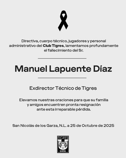 A través de sus redes sociales, el Club Tigres de la UANL lamentó el fallecimiento de Lapuente Díaz, quien fue estratega del cuadro neoleonés.