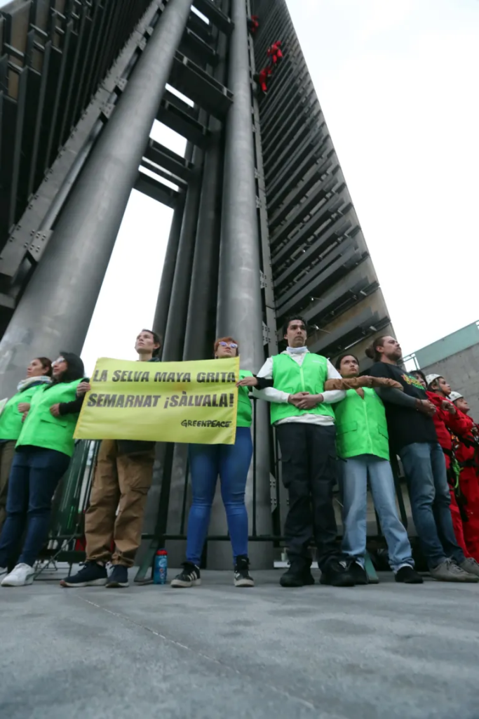 Durante la protesta, 9 activistas escalaron los 70 metros del monolito ubicado en la Ciudad de México para desplegar una pancarta de 27 metros dirigida a la Secretaría de Medio Ambiente y Recursos Naturales (Semarnat) con el mensaje: “La Selva Maya Grita. Semarnat, ¡Sálvala!”.