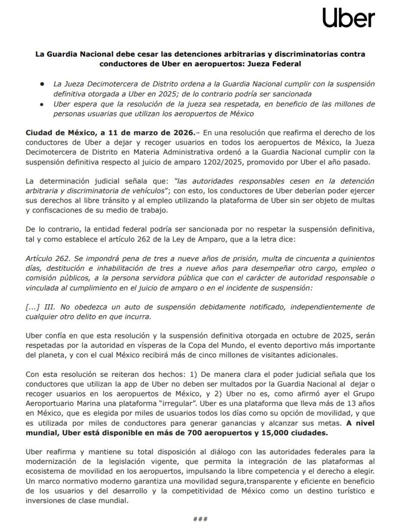 Uber sostuvo asimismo que no es una plataforma irregular y reiteró su disposición al diálogo para la modernización de la legislación vigente que permita su integración al ecosistema de movilidad en aeropuertos.