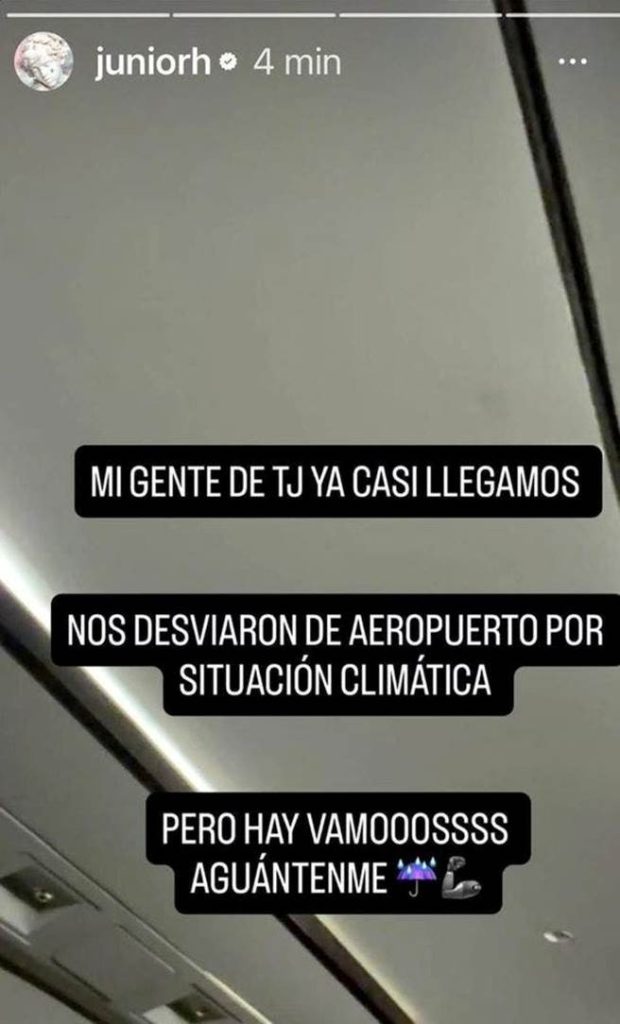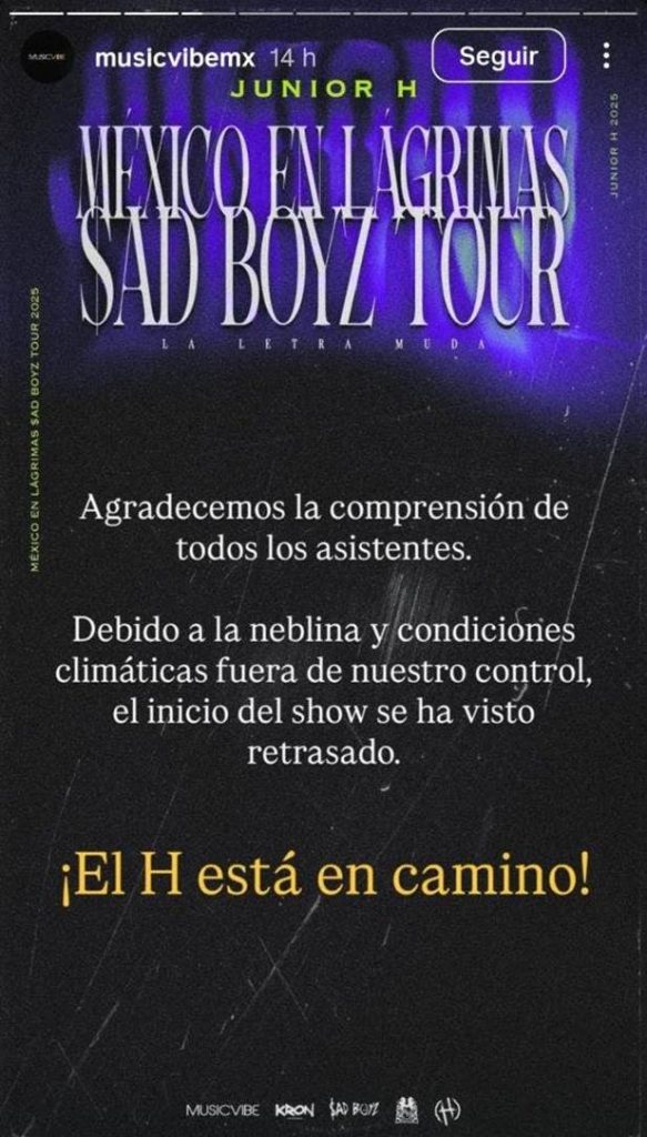Según las historias de Instagram de MusicVibe, promotora del concierto, el imprevisto se dio debido a las condiciones del clima, las cuales hicieron que el vuelo de Junior H fuera desviado (confirmado por el artista igualmente en sus redes sociales).