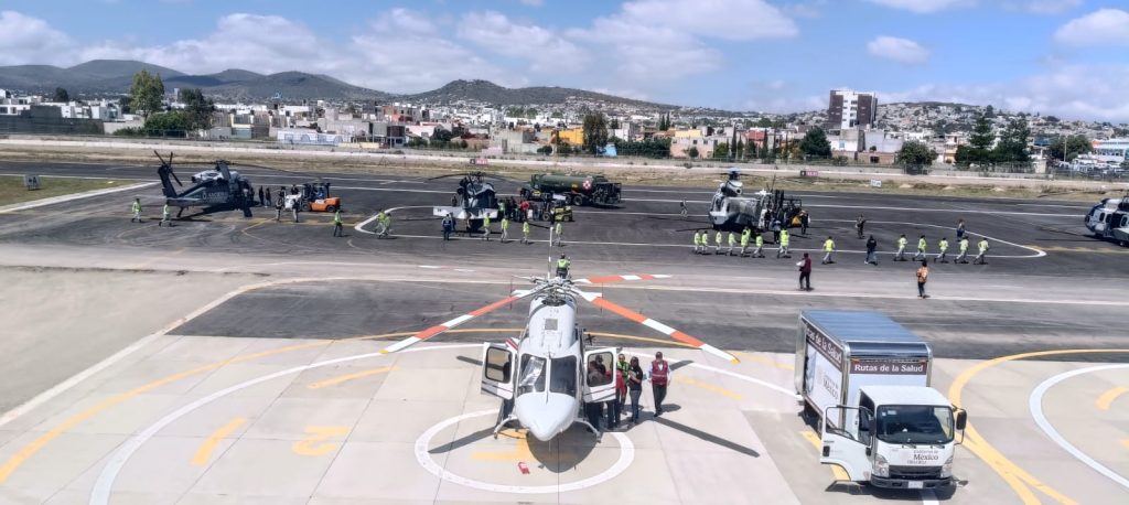 Asimismo, se reforzó el apoyo aéreo con 14 aeronaves de ala rotativa adicionales, incrementando a 21 helicópteros los empleados, siendo en total: 14 en el Estado de Hidalgo, 4 en el Estado de Puebla y 3 en el Estado de Veracruz, lo que ha permitido ampliar la capacidad de traslado de ayuda y acelerar la atención a las zonas más afectadas. En apoyo a las tareas terrestres, se desplegaron 9 unidades de maquinaria pesada y 12 volteos para el despeje de caminos en Poza Rica y Álamo, Veracruz, además del envío de 500 integrantes de la Guardia Nacional a este último municipio, con el propósito de fortalecer las operaciones de apoyo y seguridad.