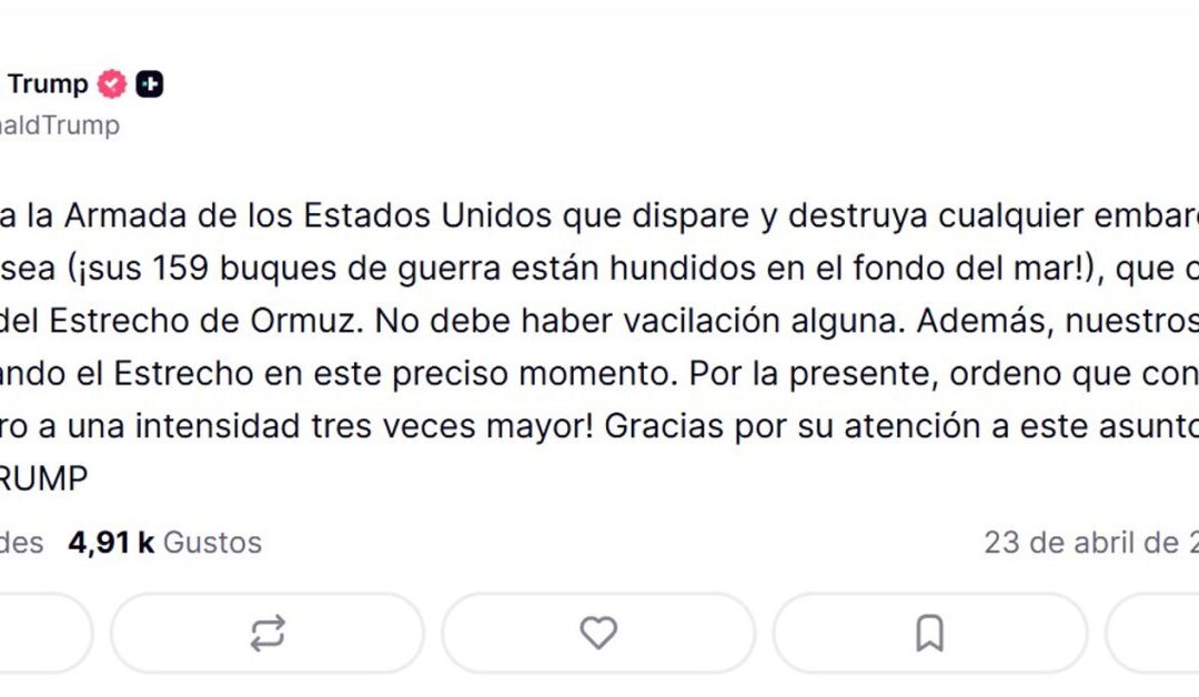 “He ordenado a la Armada de Estados Unidos disparar y hundir cualquier embarcación que esté colocando minas en las aguas del estrecho de Ormuz, por pequeñas que sean (¡sus buques de guerra, los 159, están TODOS en el fondo del mar!). No debe haber ninguna vacilación”, anunció Trump en su red Truth Social.