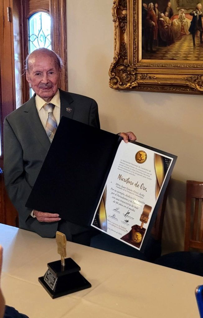 La Asociación Nacional de Locutores de México A.C. (ANLM) que preside la maestra Rosalía Buaún Sánchez otorgó el Micrófono de Oro, máximo galardón de la asociación civil, al decano del periodismo tamaulipeco don Juan Simón Pérez Ávila por su larga trayectoria de más de ocho décadas de actividad en la Prensa Escrita y en la Locución.
