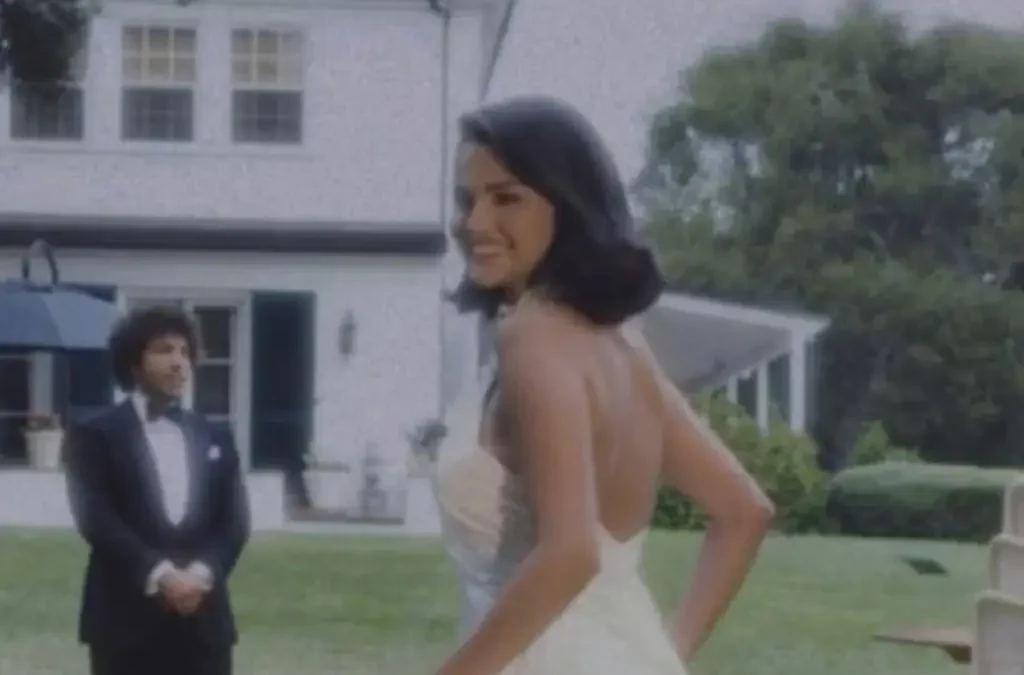 En la publicación se puede ver a Selena Gómez con un vestido blanco y a su esposo vestido con un tradicional esmoquin negro, camisa blanca y una corbata de moño