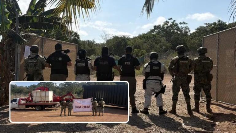 Elementos de la Secretaría de Marina (Semar) y de la Fiscalía General de la República (FGR) aseguraron un inmueble presuntamente utilizado por la delincuencia organizada para almacenar hidrocarburo en la comunidad de La Peñita de Jaltemba, municipio de Compostela, Nayarit.